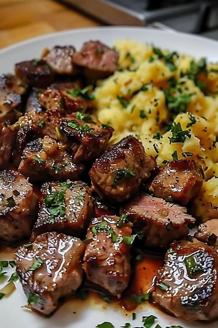 Voeg de biefstukblokjes in een enkele laag toe aan de koekenpan (mogelijk moet u ze in porties bakken).