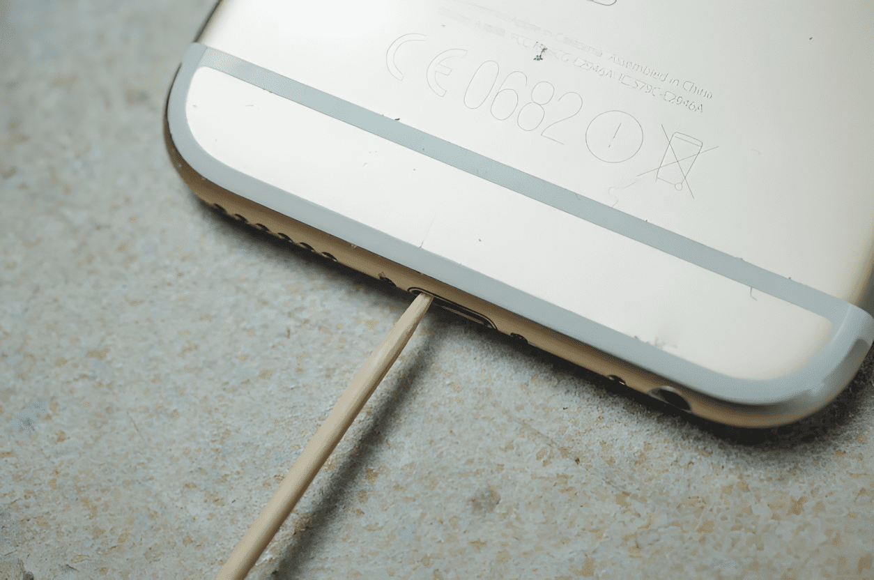 Het is een eenvoudige taak om de poort van je telefoon te ontstoppen. Je hebt een cocktailprikker, tandenstoker of ander dun voorwerp nodig dat je in de poort kunt steken om het vuil eruit te schrapen. Hout of plastic is beter, omdat het minder snel ergens tegenaan schuurt en mogelijk schade veroorzaakt. Ik heb dit gedaan met een metalen SIM-verwijderingstool en de pin op de achterkant van een oorbel en hoewel het goed werkte, is het niet de veiligste optie voor je telefoon.Â