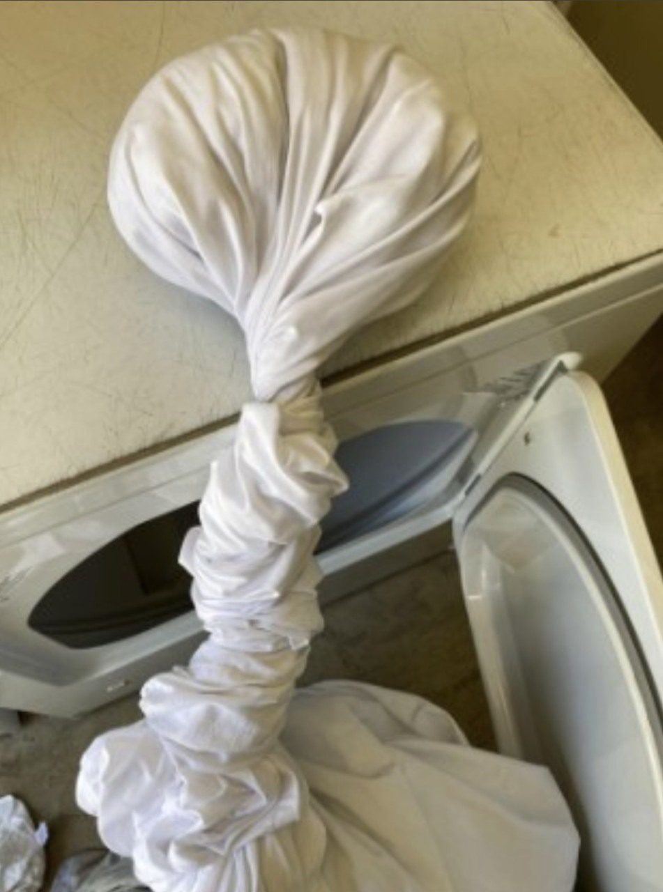 Terwijl de droger draait, verandert die klomp in een grote, gedraaide knoop.