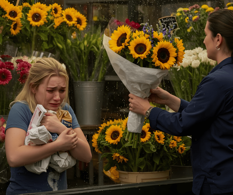 Ik pakte een stralend boeket zonnebloemen en wikkelde het in zijdepapier, waarna ik het naar haar toeschoof.