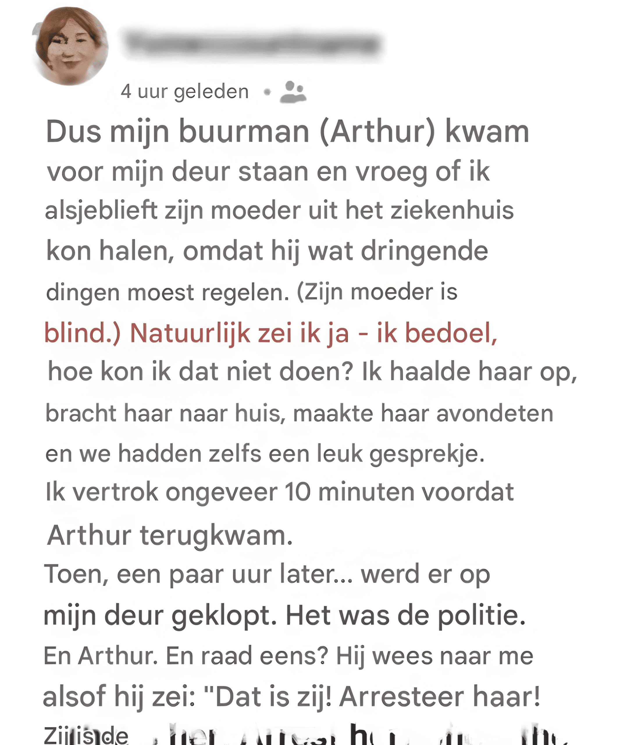 Toen mijn buurman Arthur mij vroeg om zijn blinde moeder Maria op te halen uit het ziekenhuis, stemde ik zonder aarzelen in.