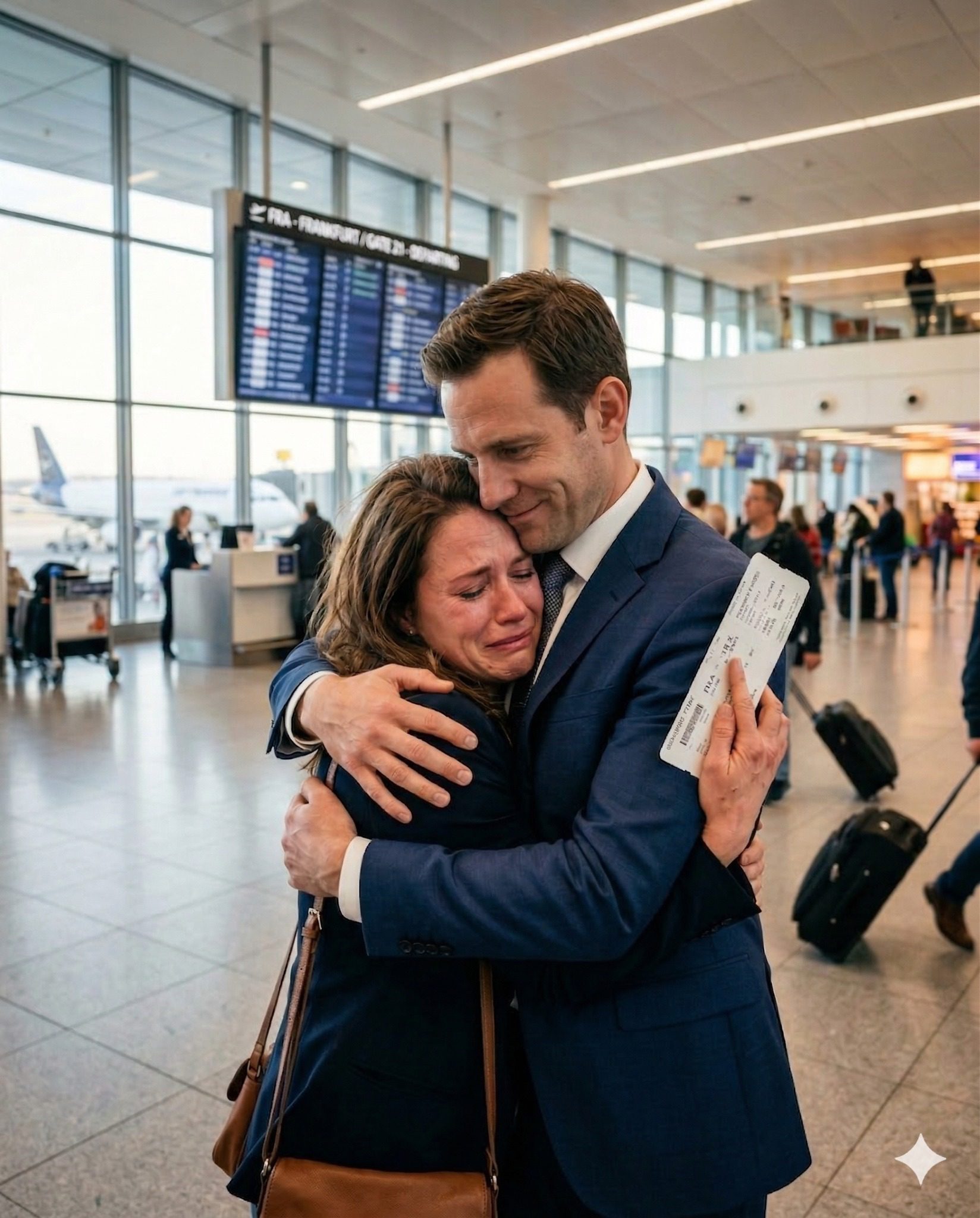 De woorden voelden als balsem op mijn gekwetste hart. Ik knikte, hoewel de brok in mijn keel het moeilijk maakte om te slikken. Hij draaide zich om en liep naar de veiligheidscontrole, zijn lange, zelfverzekerde gestalte stak af tegen de zee van vreemden. Voordat hij in de menigte verdween, draaide hij zich nog een keer om en zwaaide nog een laatste keer.