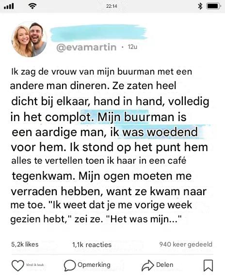 Tegenover een vreemde zittend, lachte ze en leunde naar hem toe, haar hand rustend op de zijne. Te dichtbij. Te intiem. Mijn hart zonk in mijn schoenen. De conclusie leek voor de hand liggend.
