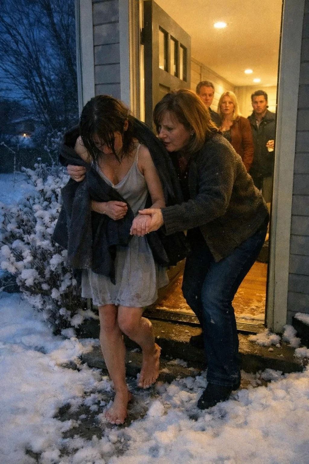 Ik kwam eerder aan dan gepland, zo’n vroeg moment dat meestal gepaard gaat met goede bedoelingen en zonder waarschuwing, met een nog warme taart uit de oven en mijn gedachten afgedwaald naar de gedachte dat mijn dochter misschien, heel misschien, eindelijk haar draai had gevonden in het leven dat ze me had beloofd gelukkig te zijn, totdat ik haar aan de rand van de voortuin zag staan, op blote voeten in de sneeuw, haar handen stevig voor zich gevouwen alsof zichzelf staande houden de enige instructie was die ze had gekregen.De sneeuw viel al urenlang zachtjes, zo zacht dat het er onschuldig uitzag, maar zo onophoudelijk dat alles wat het aanraakte gevoelloos werd. Ze stond daar zonder jas, zonder schoenen, haar adem kwam in dunne wolkjes naar buiten, haar ogen gericht op de grond alsof ze had geleerd dat omhoogkijken de situatie alleen maar erger maakte.Het duurde even voordat ik begreep wat ik zag, want geen enkele moeder verwacht haar volwassen dochter zo tentoongesteld te zien, als een straf, als een waarschuwing, als een les die moet worden nageleefd in plaats van in twijfel getrokken.Mijn stem brak haar naam in tweeën.