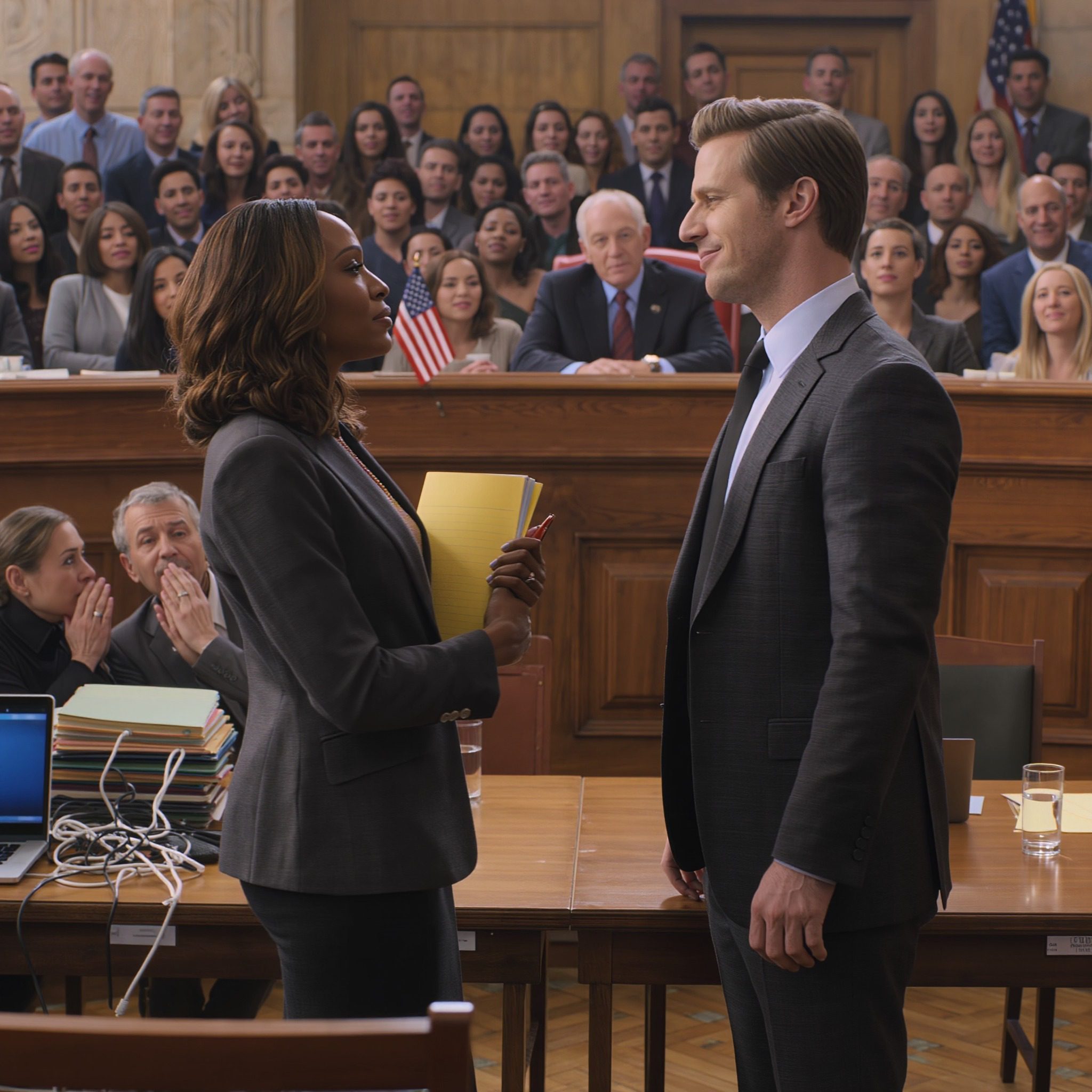 Ik voelde me piepklein. De airconditioning in de rechtszaal was koud en ik rilde lichtjes, mijn huid prikte onder de dunne stof van mijn toga. In tegenstelling tot de tafel van de verdediging – volgestouwd met juridische assistenten, dure laptops en dikke stapels keurig ingebonden bewijsmateriaal – was de mijne leeg, op een eenvoudig geel notitieblokje en een plastic bekertje lauw water na.