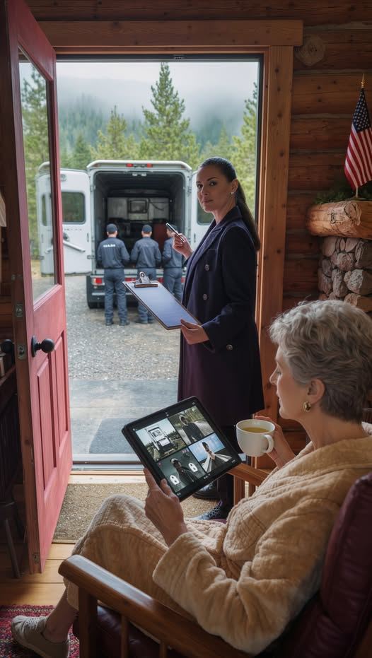 Ik zat heerlijk te ontspannen in mijn berghut toen om 5 uur ‘s ochtends het alarm afging. De bewaker riep nerveus: « Mevrouw Harland… uw schoondochter is hier met de verhuizers. Ze zegt dat u moet vertrekken. Ze zegt dat het huis nu van haar is. » Ik nam een ​​slokje thee en glimlachte. « Laat haar binnen, » zei ik. « Ze komt er zo achter wat ik gisteren heb gedaan. »