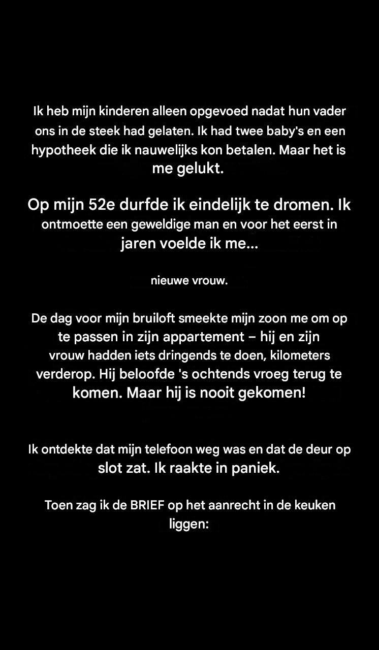 De dag voor mijn bruiloft smeekte mijn zoon me om op zijn kinderen te passen in zijn appartement. De volgende ochtend realiseerde ik me dat mijn telefoon weg was en de deur op slot zat. Ik zat opgesloten! Ik vond toen een briefje en mijn paniek sloeg om in verdriet toen ik ontdekte waarom ik gevangen was gehouden.