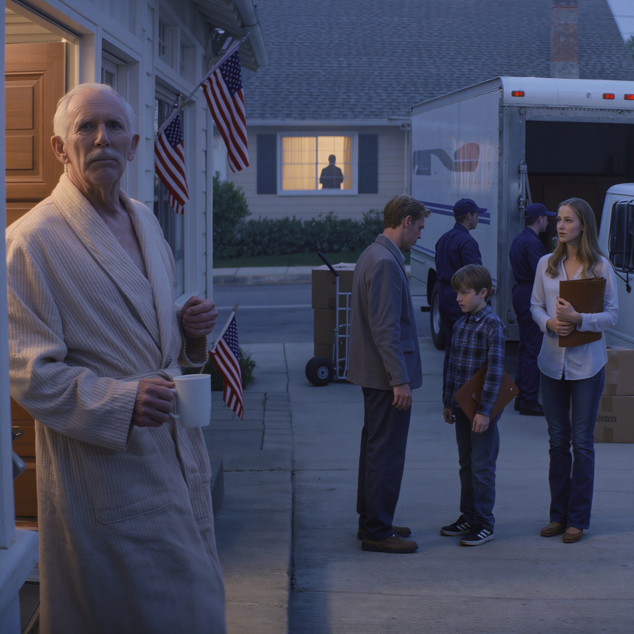 Door het matglas van de voordeur zag ik gestalten – meer dan één – op mijn veranda staan. Het bewegingsdetectielampje was aangegaan en wierp een fel wit licht op hen. Toen ik de deur opendeed, stond mijn zoon Daniel voor me. Naast hem stond Claire, zijn vrouw met wie hij al acht jaar getrouwd was, die een leren map als een pantser tegen haar borst hield. Achter hen stonden drie mannen in identieke marine-uniformen te wachten bij een grote vrachtwagen die op mijn oprit geparkeerd stond. De woorden Premiere Moving Services stonden in gouden letters op de zijkant geschilderd. De motor draaide nog, de uitlaatgassen stegen op in de koude ochtendlucht als de adem van een slapend beest.