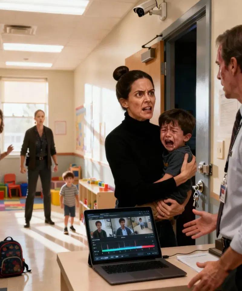 Ik zette mijn zoon af zoals elke andere dag – totdat een leraar me tegenhield en rustig zei: “Ga alsjeblieft nog niet.” Mijn hart viel terwijl ik mijn kind hoorde schreeuwen van achter een gesloten deur. Ik barstte binnen en werd verdoofd. Mijn zoon trilde en de verzorger spotte: “Hij is gewoon dramatisch – blijf erbuiten.” Ik veegde hem in mijn armen en eiste de beveiligingsbeelden. Het gezicht van de regisseur draineerde van kleur. ‘Dat was je niet bedoeld,’ zei ze. Wat ik vervolgens ontdekte, verzegelde mijn vastberadenheid – iemand zou verantwoordelijk worden gehouden.