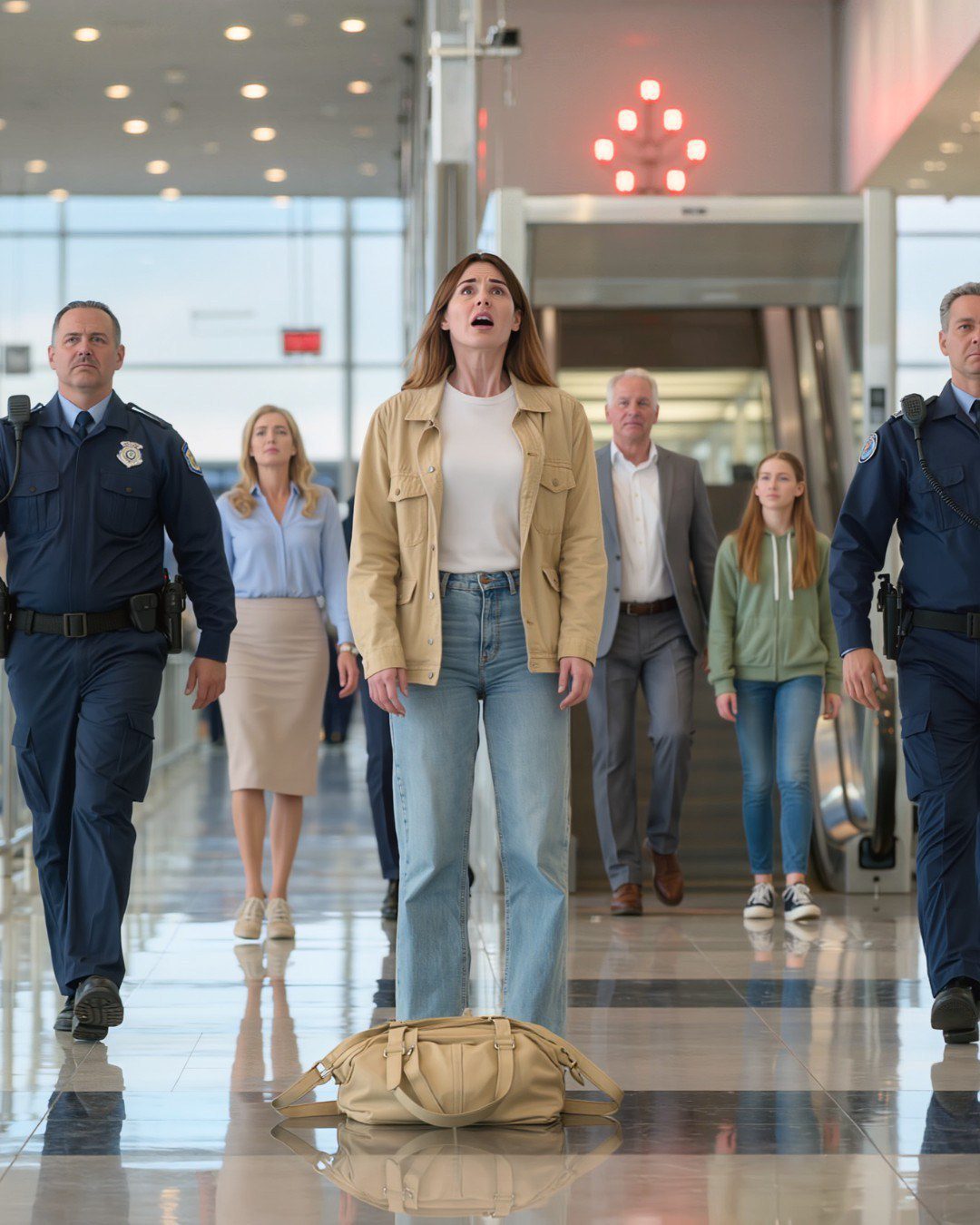 De veiligheidspoort net voorbij de gate – die ik niet eens had opgemerkt – begon luid te piepen. Rode lampjes knipperden. Twee geüniformeerde luchthavenagenten draaiden zich abrupt om, hun handen al getrokken.