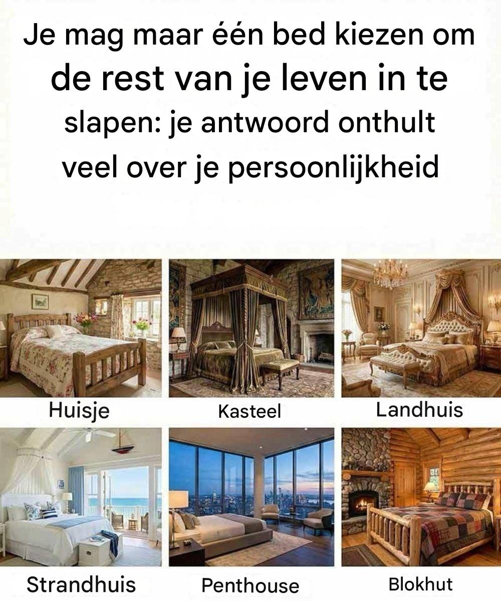 Zou je kiezen voor de knusse warmte van een huisje? De grandeur van een kasteel? De elegantie van een herenhuis? De ontspannen rust van een strandhuis? De strakke hoogte van een penthouse? Of het rustieke comfort van een blokhut?