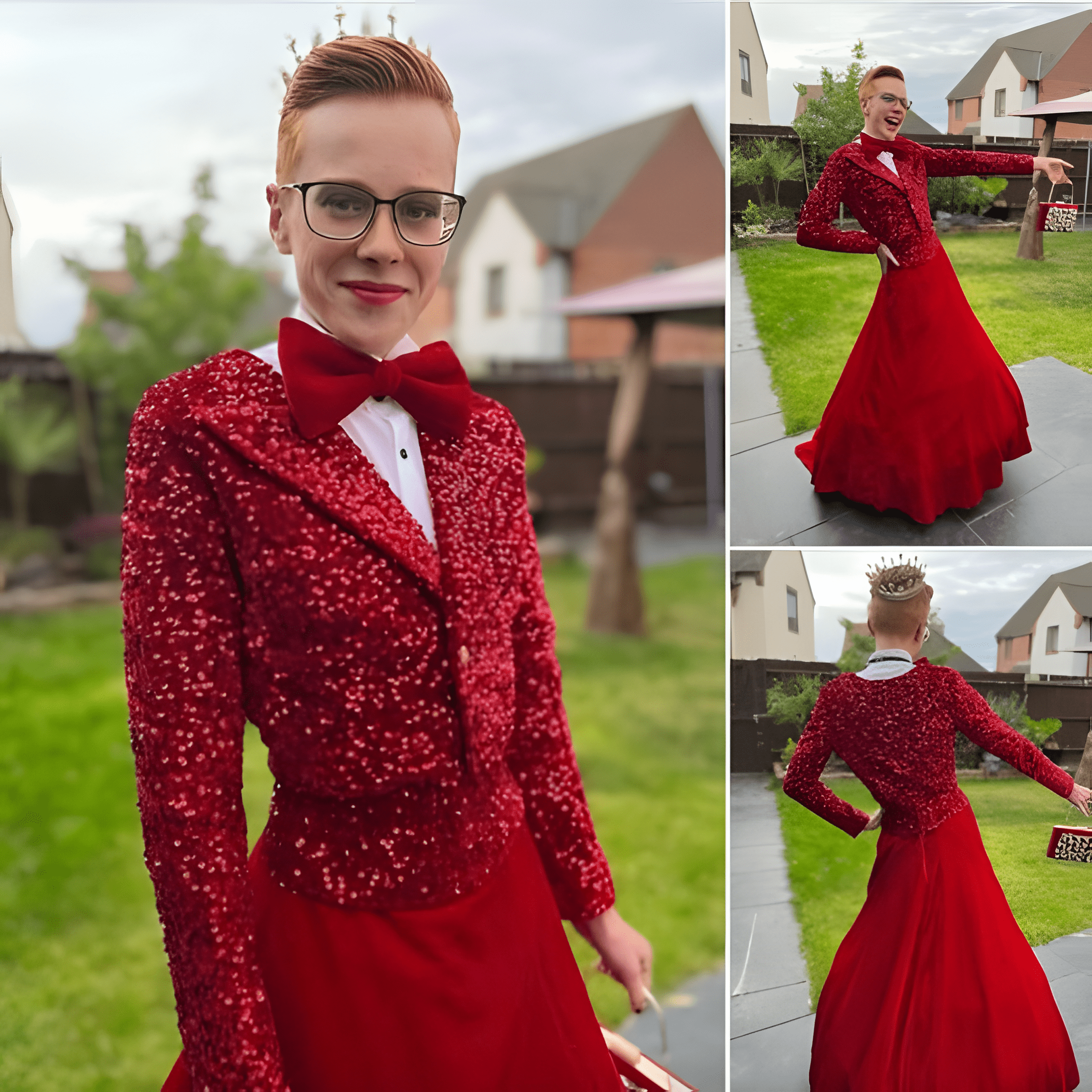 De 16-jarige Korben White, die poseert in een vuurrode rok en een topje met een paillettenpakje dat perfect bij zijn scharlakenrode haar past, blies het internet op met zijn golvende baljurk die hij droeg voor zijn schoolbal.