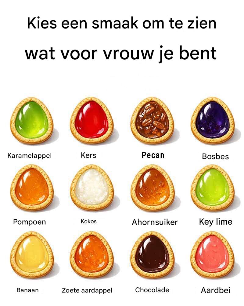 Er schuilt iets speels en vreemd genoeg onthullends in de keuzes die we maken, vooral als het om eten gaat. Deze afbeelding nodigt je uit om een smaak te kiezen, maar onder de oppervlakte stelt ze eigenlijk een diepere vraag: wat voor vrouw ben je?