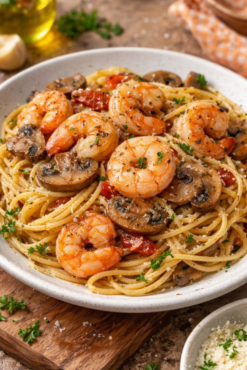 Ingrediënten voor het bereiden van knoflookpasta met garnalen en champignons