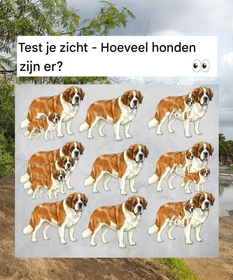 Als je even de tijd neemt en goed kijkt, zie je extra contouren, vage vormen en overlappende figuren die op het eerste gezicht niet opvallen. Sommige honden zijn gedeeltelijk in andere opgegaan, terwijl een paar bijna gecamoufleerd zijn in de achtergrond – net genoeg om je oog voor detail op de proef te stellen.