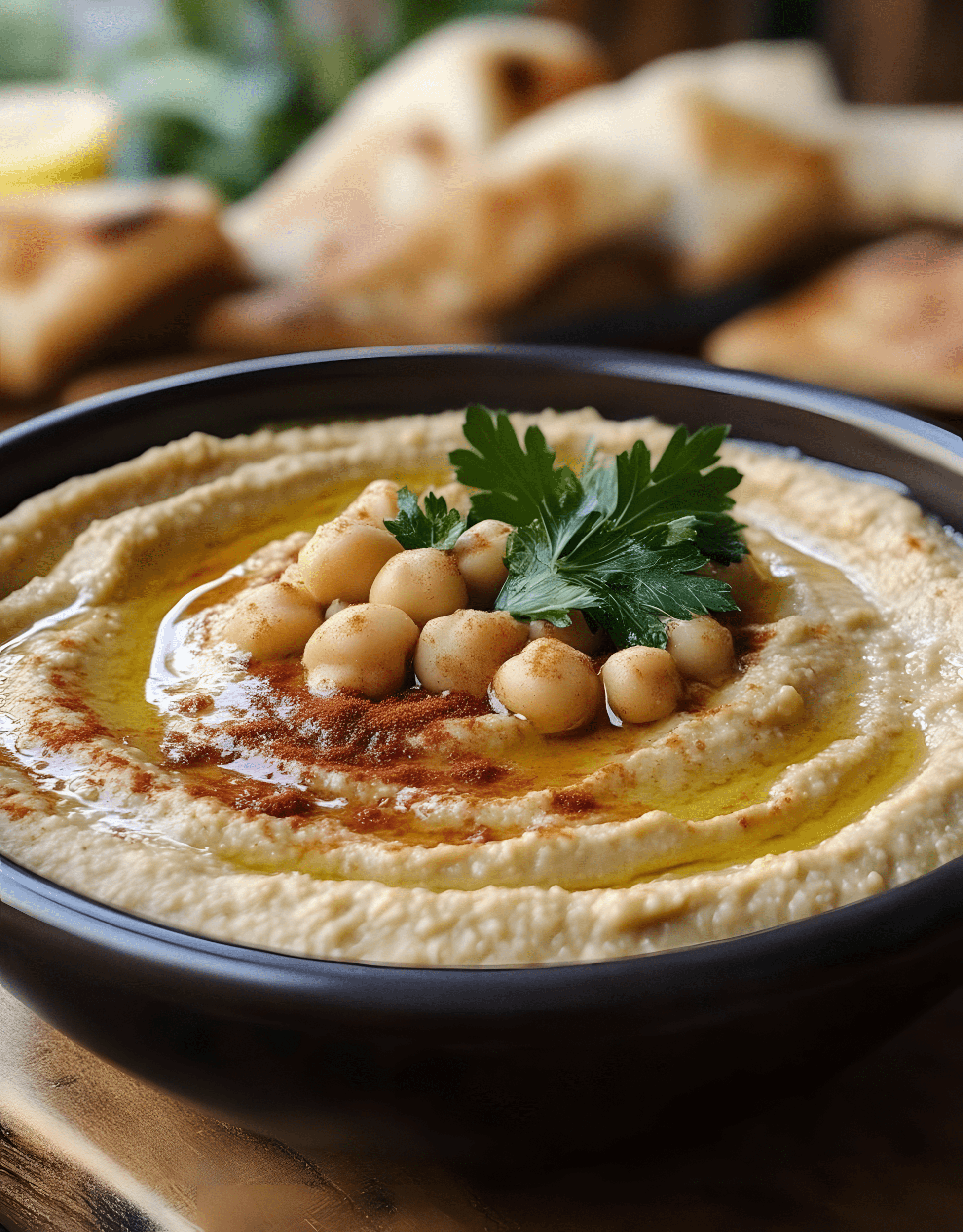 Giet de hummus in een ondiepe schaal en spreid hem uit met de achterkant van een lepel, waarbij je een kuiltje in het midden maakt. Besprenkel met olijfolie , bestrooi met paprikapoeder of sumak en voeg een beetje gehakte verse peterselie toe .