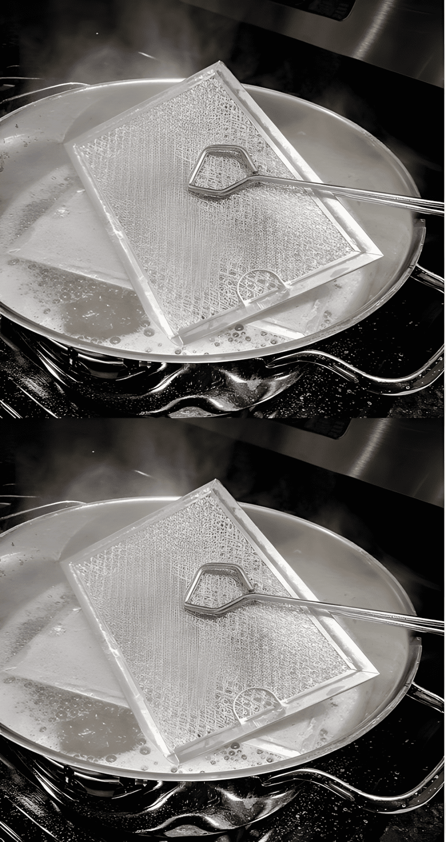 Dompel de ventilatieopeningen onder: Zet het vuur uit om overkoken te voorkomen door de reactie tussen baking soda en water. Plaats de ovenventilatieopeningen voorzichtig in de hete baking soda-oplossing met behulp van uw keukenschaartang.