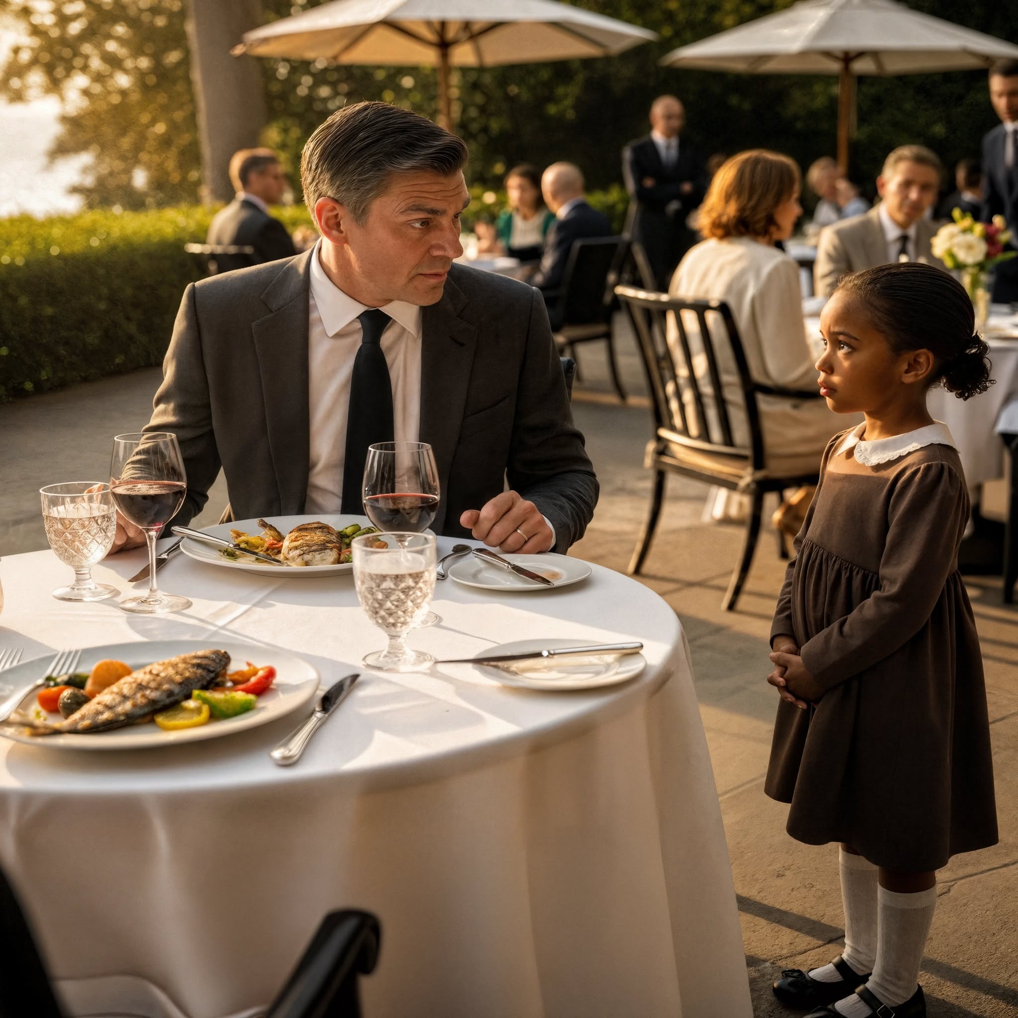 Het restaurant werd stil. De gasten schoven onrustig heen en weer op hun stoelen, sommigen spotten met het kind omdat ze het had durven wagen zo’n exclusieve plek binnen te gaan. Een ober snelde toe en fluisterde: « Meneer, ik zal haar onmiddellijk naar buiten begeleiden. »