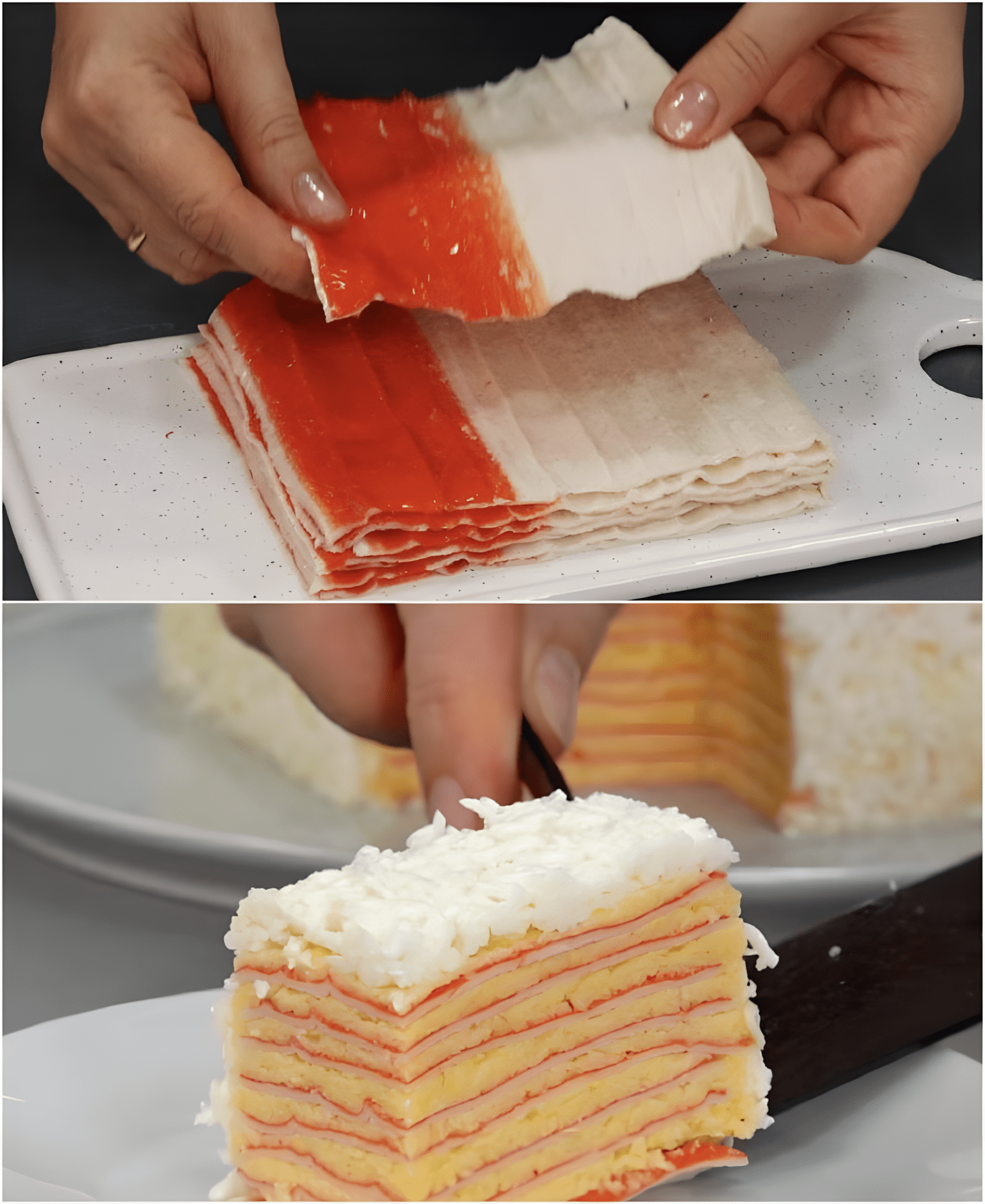 Deze hartige « taart » gemaakt van krabsticks is verrassend eenvoudig te maken en vormt een visueel verbluffend en heerlijk voorgerecht voor elke gelegenheid! Klaar in slechts enkele minuten.