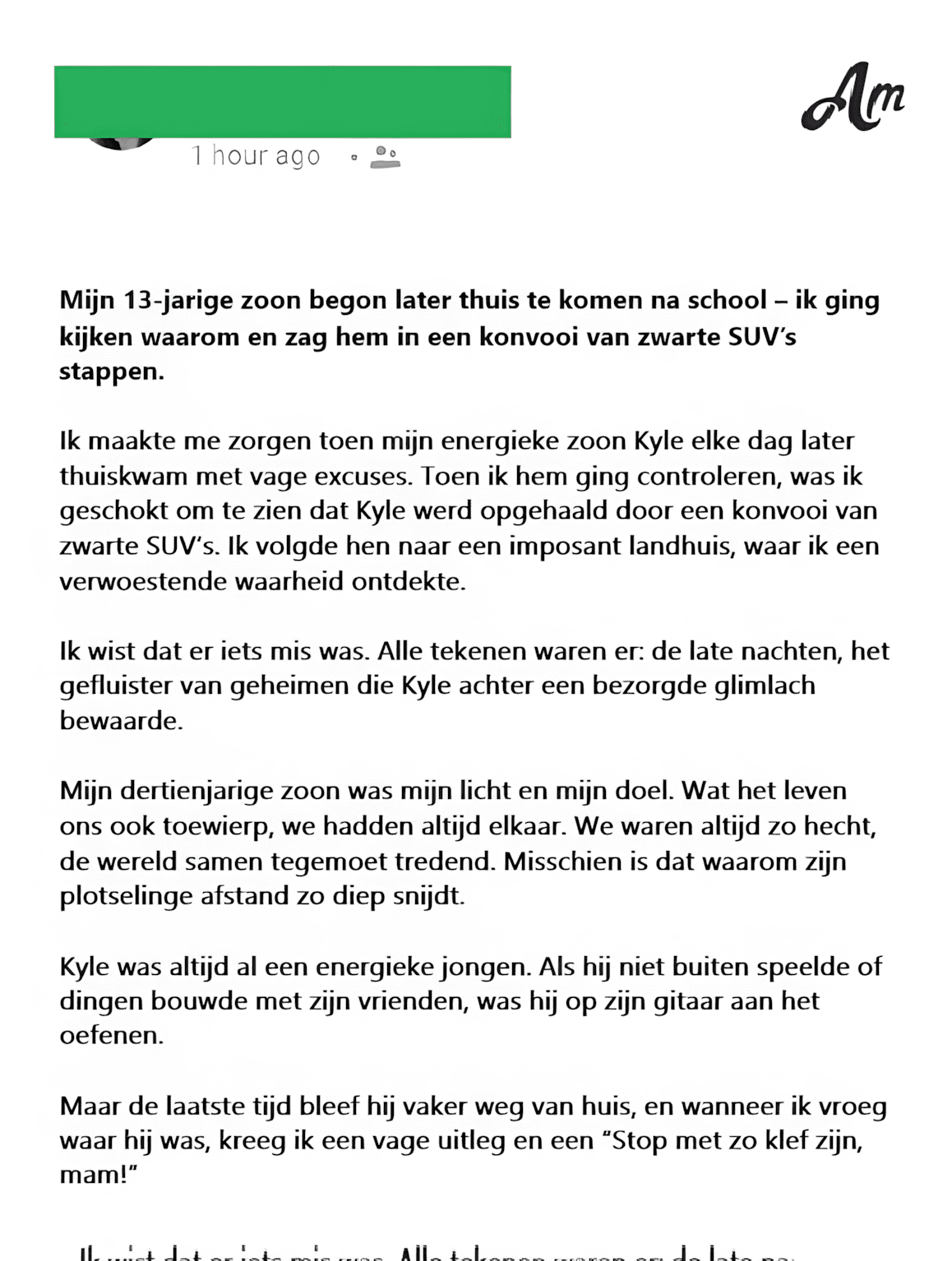Ik maakte me zorgen toen mijn energieke zoon Kyle elke dag later thuiskwam met vage excuses. Toen ik hem ging controleren, was ik geschokt om te zien dat Kyle werd opgehaald door een konvooi van zwarte SUV’s. Ik volgde hen naar een imposant landhuis, waar ik een verwoestende waarheid ontdekte.