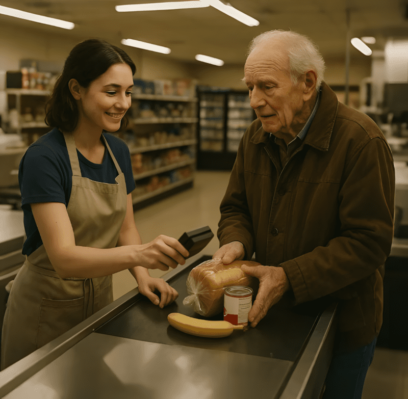 Zijn kleren waren versleten, zijn schoenen afgedragen, en zijn handen trilden licht toen hij een paar artikelen op de lopende band legde: een brood, een blik soep, een klein pak melk en een banaan.