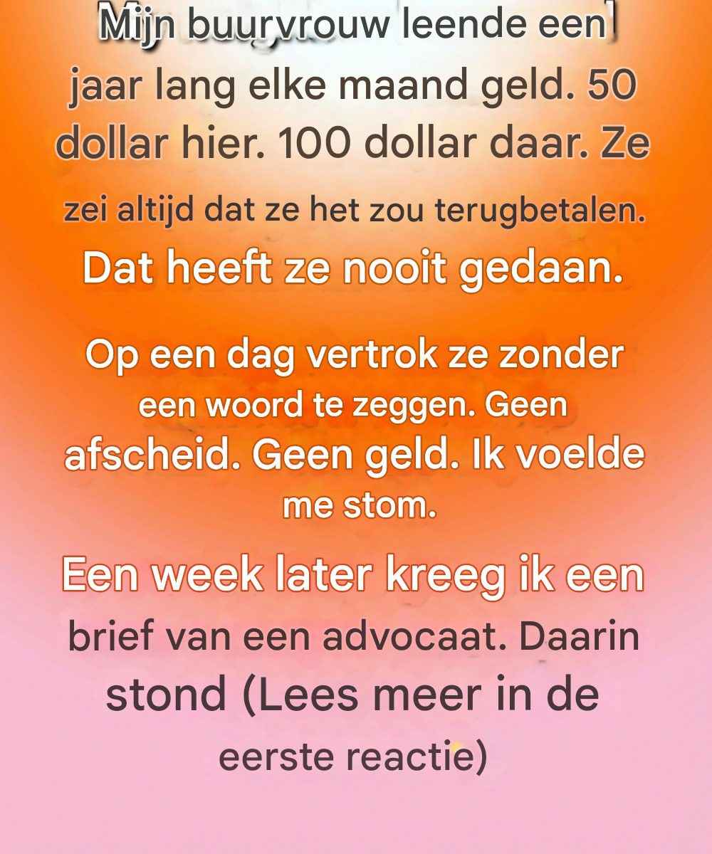 Ze sprak zachtjes, was respectvol en klopte nooit op mijn deur zonder eerst haar excuses aan te bieden. Aanvankelijk waren haar verzoeken bescheiden: een paar biljetten voor boodschappen voordat haar salaris binnenkwam, een iets groter bedrag toen haar auto kapot ging en ze bang was haar baan te verliezen. Elke keer verzekerde ze me dat ze het geld snel zou terugbetalen. Ik geloofde haar, vooral omdat ze nooit om luxe of comfort vroeg – alleen genoeg om het hoofd boven water te houden. Naarmate de maanden verstreken, liepen de bedragen stilletjes op, maar ik bleef mezelf voorhouden dat het helpen van iemand die het moeilijk had, gewoon het juiste was om te doen.