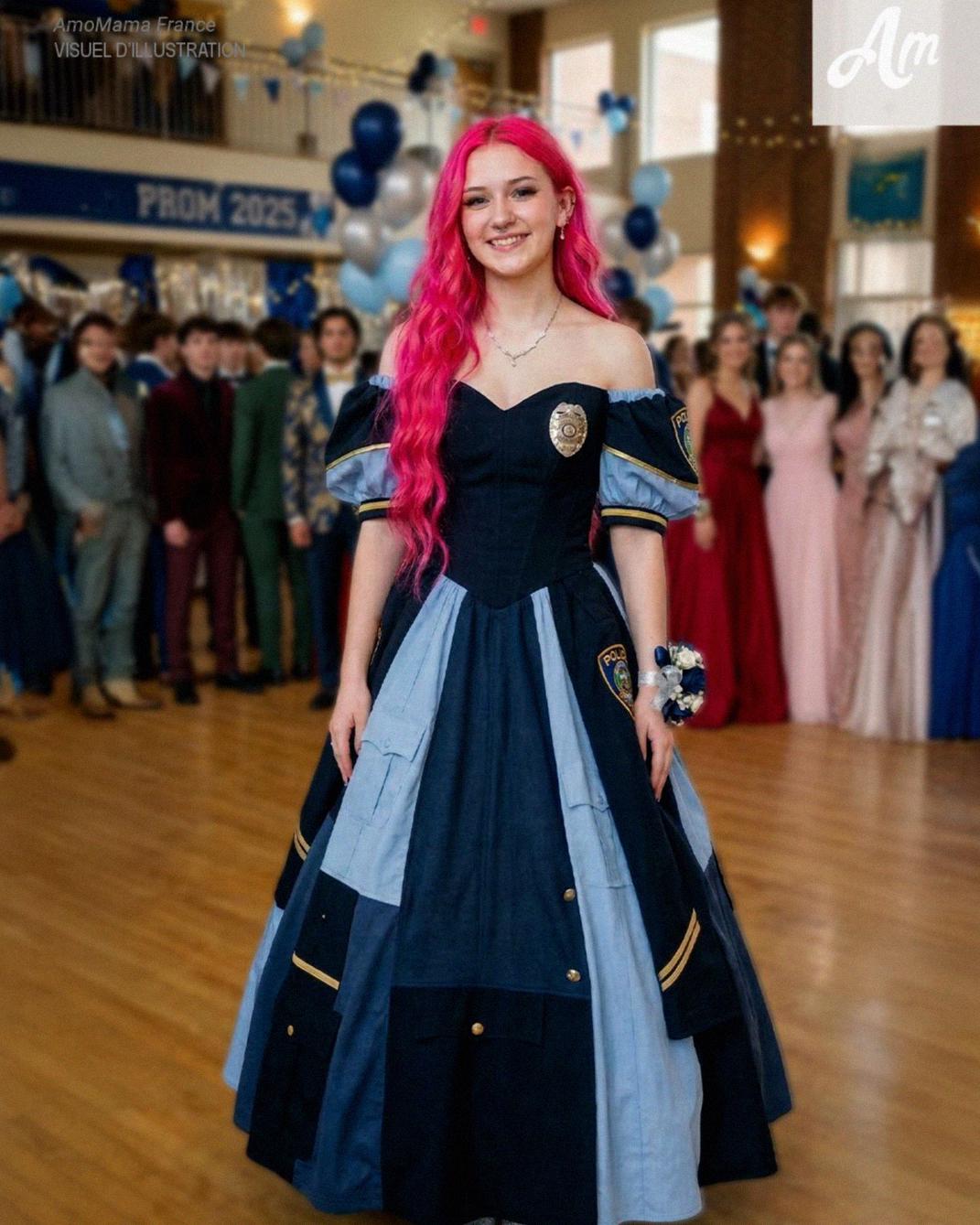 Mijn dochter droeg een baljurk die ze had gemaakt van het politie-uniform van haar overleden vader. Toen een meisje er punch overheen morste, bleef ze roerloos staan en probeerde ze haar badge schoon te maken. Toen pakte de moeder van dat meisje de microfoon… en onthulde iets onverwachts.