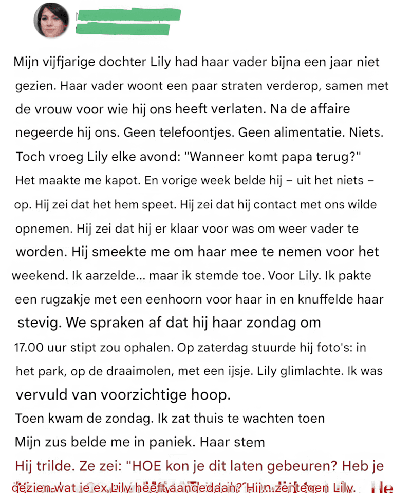Toen ik Lily alleen op een bankje zag zitten, met haar teddybeer stevig tegen haar borst gedrukt, keek ze me met grote, vermoeide ogen aan en fluisterde: « Mam, kunnen we nu naar huis? »
