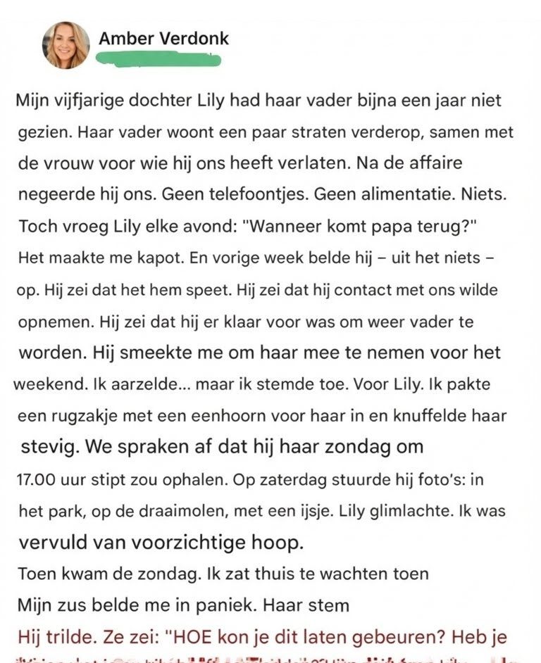 Toen ik Lily alleen op een bankje zag zitten, met haar teddybeer stevig tegen haar borst gedrukt, keek ze me met grote, vermoeide ogen aan en fluisterde: « Mam, kunnen we nu naar huis? »