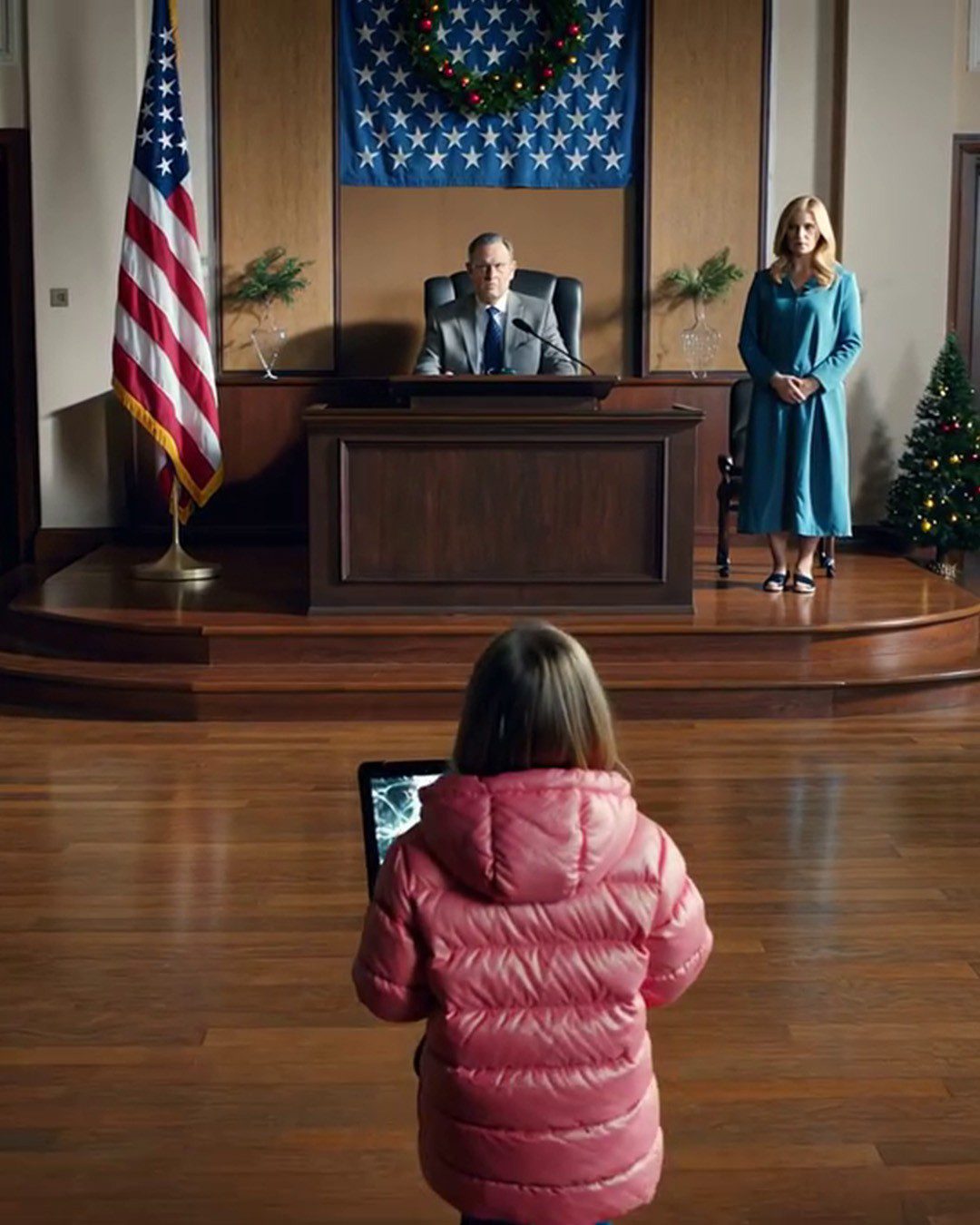 Daar stond ze, kleiner dan ik haar ooit in die immense rechtszaal had gezien: mijn dochter Ruby. Ze hoorde daar niet te zijn. Ze klemde haar rugzak tegen haar borst, haar ogen wijd open en vol angst. Maar ze rende niet naar me toe. Ze rende niet naar haar vader. Ze liep rechtstreeks naar de bank, haar kleine sneakers piepten op de marmeren vloer, en in haar hand hield ze een gebroken, met tape vastgeplakte tablet waarvan ik dacht dat die al maanden geleden kapot was gegaan.