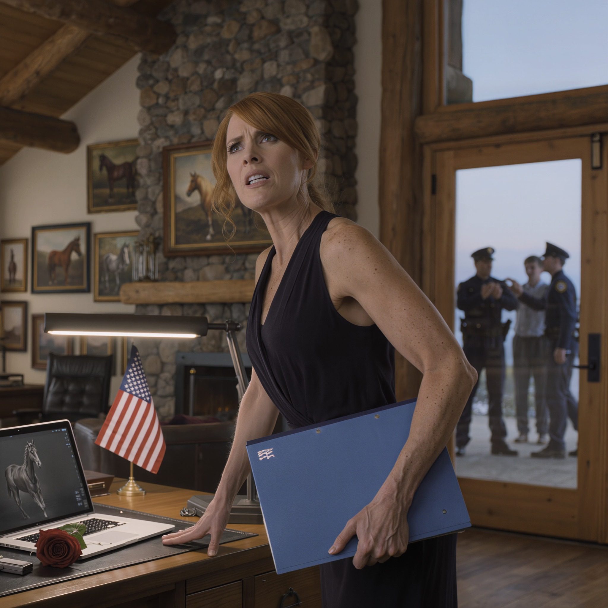 Mijn man was net overleden en zijn advocaat gaf me een sleutel met een verzegelde brief; ik was alleen van plan naar Canada te vliegen, de boerderij te verkopen en er verder geen aandacht meer aan te besteden… maar precies 48 uur later stonden de broers van mijn man met de politie voor de deur, bonzend alsof het hun eigen huis was – terwijl binnen in het ‘landhuis’, dat van vloer tot plafond volhing met schilderijen van paarden, een laptop klaar lag te wachten tot ik hem openmaakte.