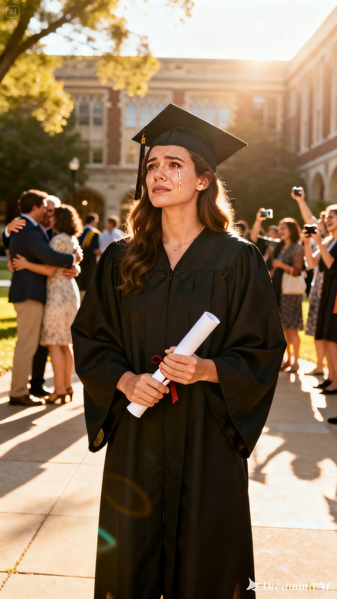 Na de ceremonie was de binnenplaats een chaotische, gezellige drukte van families. Ik stapte opzij, mijn afstudeerpet stevig vastgeklemd, en deed alsof ik een berichtje aan het typen was. Een vrouw van in de vijftig, de moeder van een andere afgestudeerde, zag me daar alleen staan. Ze aarzelde even en leunde toen achterover.