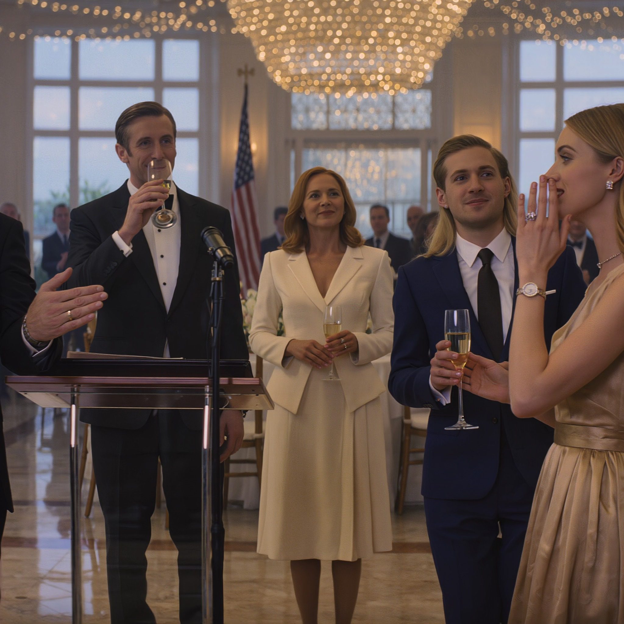 Mijn vader stapte naar de microfoon, met een champagneglas in de hand en zijn Rolex die schitterde in het licht.