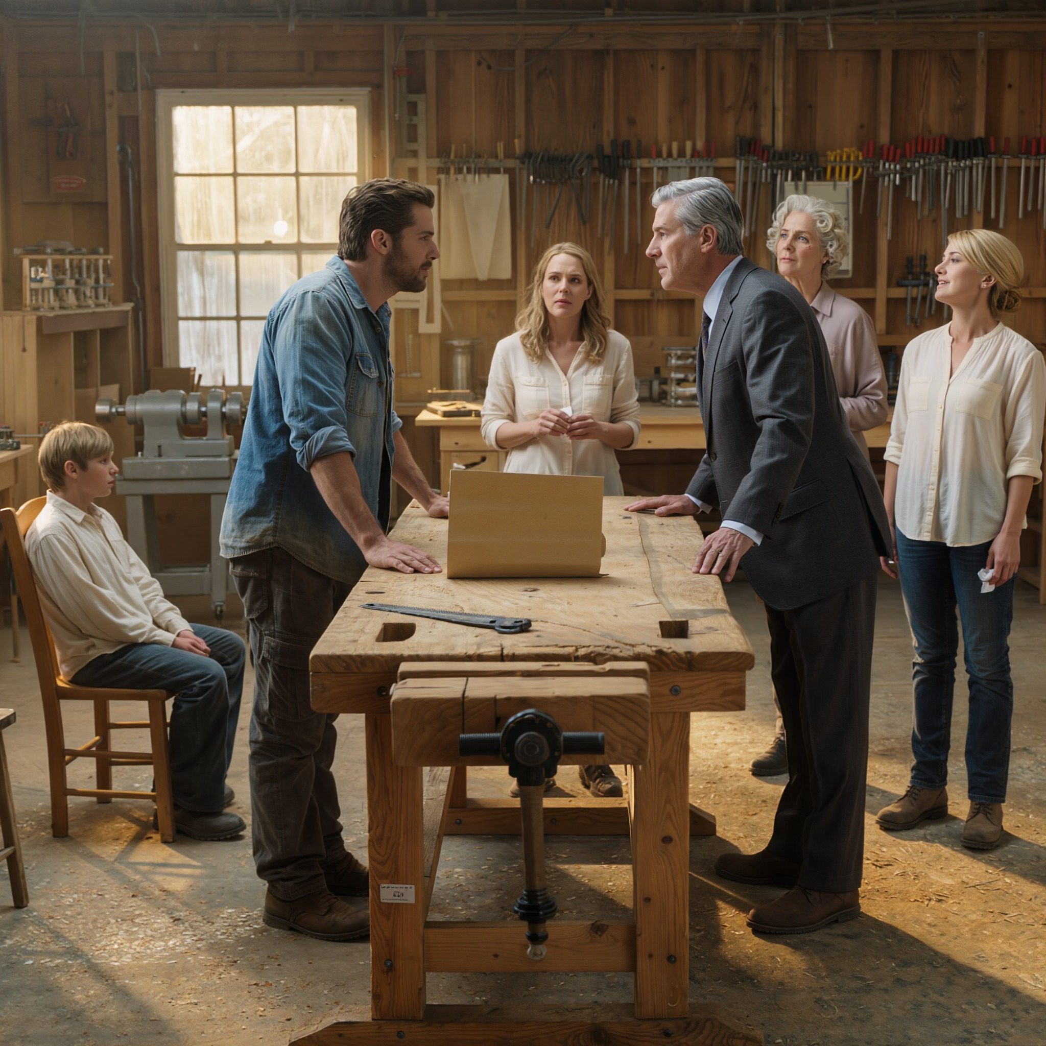 De lucht in mijn werkplaats was doordrenkt met de geur van vers gezaagd eikenhout en nog iets anders. Wanhoop. Het was niet mijn wanhoop. Het kwam in golven van mijn familie af. Mijn vader, Richard, stond midden in de ruimte, zijn dure pak stak totaal niet af tegen de achtergrond van mijn draaibanken en zagen. Zijn gezicht, dat gewoonlijk een masker van strenge teleurstelling droeg als hij me aankeek, was nu getekend door rauwe, lelijke paniek.