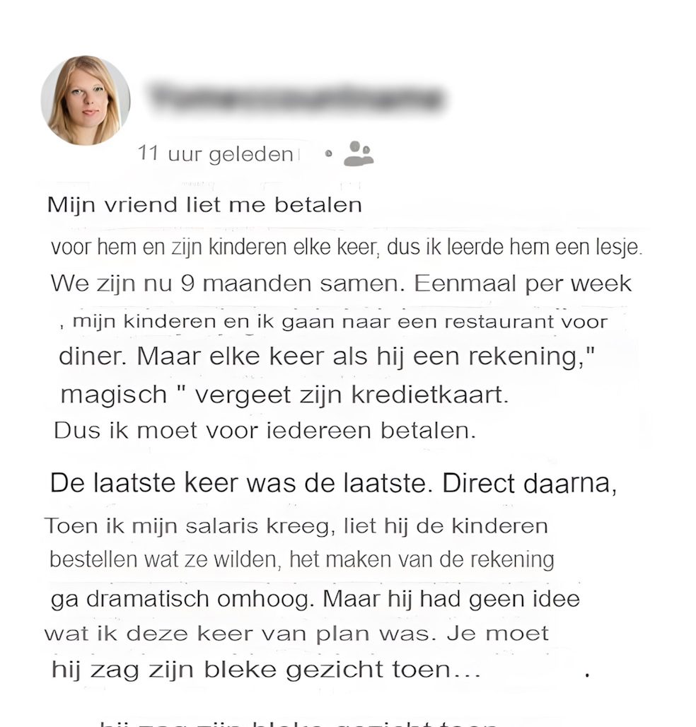 Na een moment keek hij de vrouw met een verlegen uitdrukking op zijn gezicht aan en zei: « Ik denk dat ik dit ben vergeten in de andere spijkerbroek die ik wilde dragen. » De vriend van de vrouw vroeg of ze deze keer voor het avondeten kon betalen, maar de vrouw had er genoeg van en pakte haar spullen, klaar om het restaurant te verlaten zonder zelfs maar te eten. Toen haar vriend de vrouw zag weggaan, eiste hij dat ze hem vertelde wat ze deed en waar ze naartoe ging. Ze vertelde hem dat ze niet opnieuw voor hem en zijn kinderen wilde betalen en verliet het restaurant.