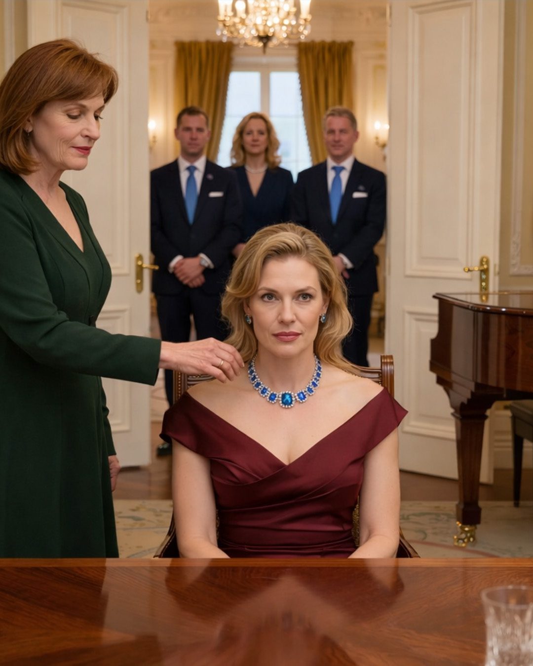 ‘Dat smaragdgroene sieraad dat je draagt,’ vervolgde Vivian, haar stem zacht maar scherp als honing, ‘is eigenlijk beter geschikt voor speciale gelegenheden, niet voor familiediners. Ik denk dat het tijd is dat je het aan mij overlaat en het in de kluis van de Montgomery-collectie bewaart, waar het thuishoort.’