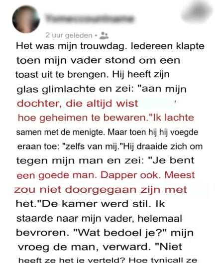 Net toen ik op het punt stond een nieuwe fase in mijn leven te beginnen met de liefde van mijn leven, Steven, besloot mijn vader alles te vernietigen. Hij deelde mijn grootste geheim met alle gasten, en het was iets wat ik Steven niet eens had verteld. Wat er toen gebeurde was zo verrassend dat mijn hart er sneller van ging kloppen en ik tot tranen toe bewoog.
