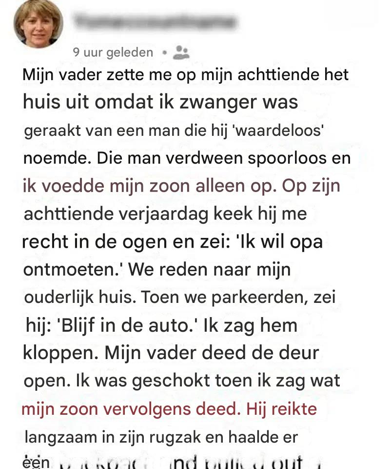 Die man verdween spoorloos, en ik voedde mijn zoon in mijn eentje op. Op zijn achttiende verjaardag keek hij me recht in de ogen en zei: “Ik wil opa ontmoeten.” We reden naar mijn ouderlijk huis.