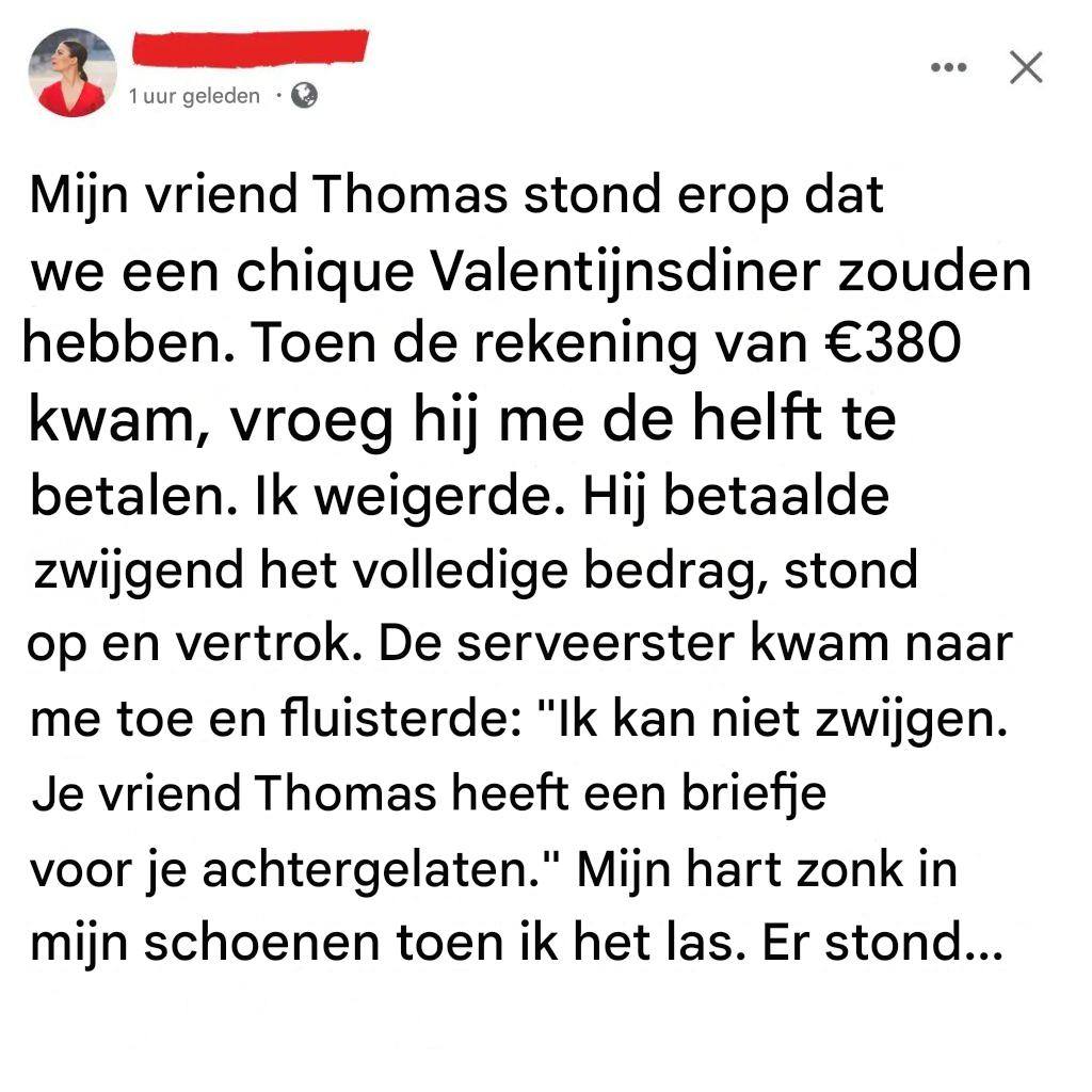 Het delen van de rekening is op zich niet ongebruikelijk. Veel stellen doen het zo. Maar in dit geval verandert de context alles. Het was zijn idee. Zijn verrassing. Zijn « speciale avond ».