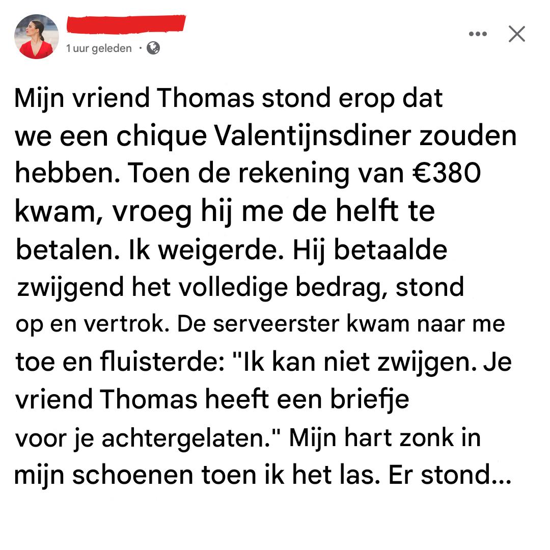 Zeven jaar liefde. Zeven Valentijnsdagen. En die avond was Camille ervan overtuigd dat er iets stond te veranderen. De gedempte verlichting, de violist, de zorgvuldig uitgekozen wijn… Alles wees op een aanstaand huwelijksaanzoek. Maar wat er toevallig gebeurde, was alles zonder romantisch. Achter een simpele rekeningdeling ging een veel diepere onthulling over hun relatie schuil.Wanneer een perfecte avond in een paar seconden in een oprit verandert