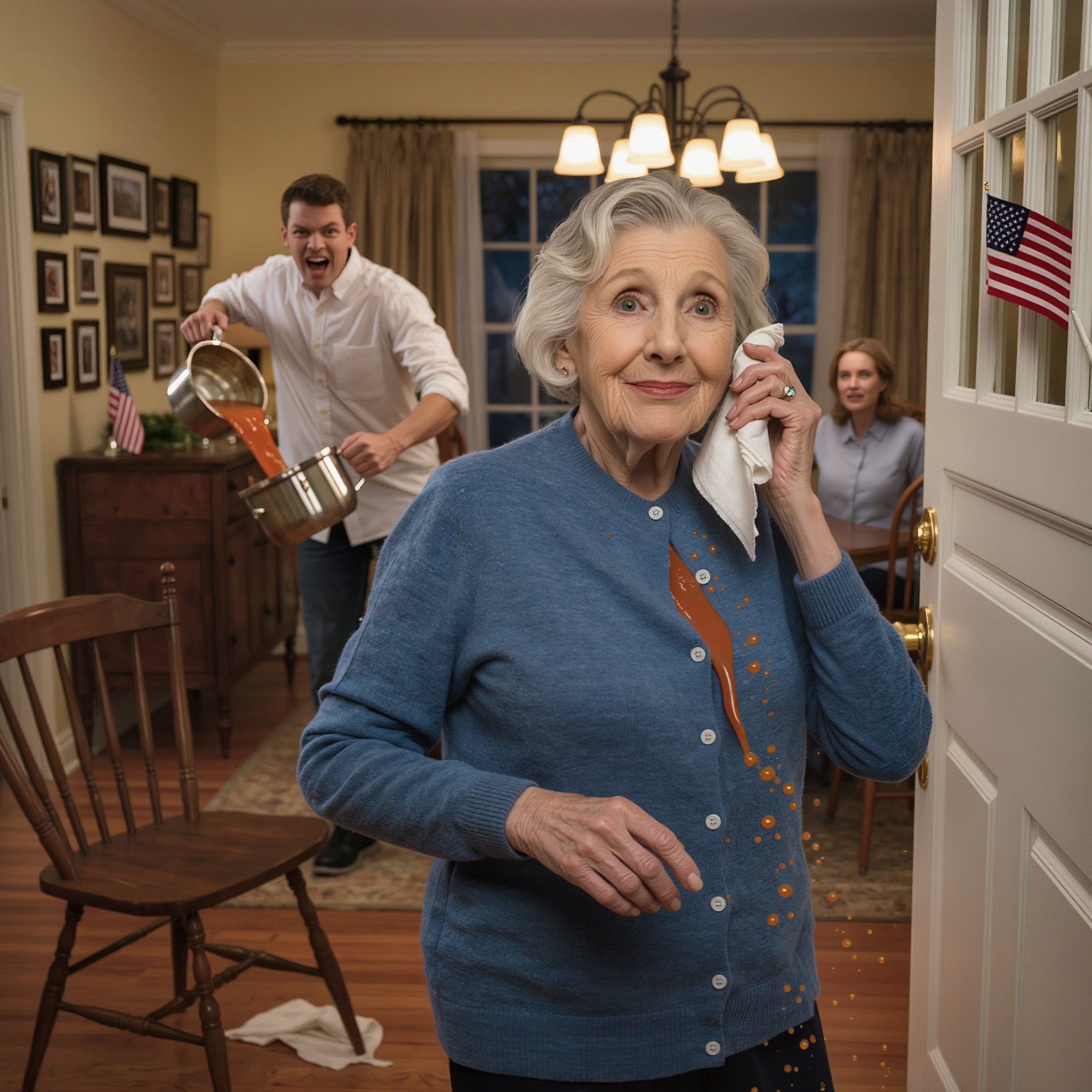 De tijd leek te vertragen terwijl ik hem zag opstaan, hem het zag optillen, en het besef te laat zag doordringen. De hete soep stroomde over mijn hoofd, brandde op mijn hoofdhuid, liep langs mijn gezicht en nek en trok in mijn favoriete vest – het blauwe vest dat Robert me voor onze laatste huwelijksverjaardag had gegeven.