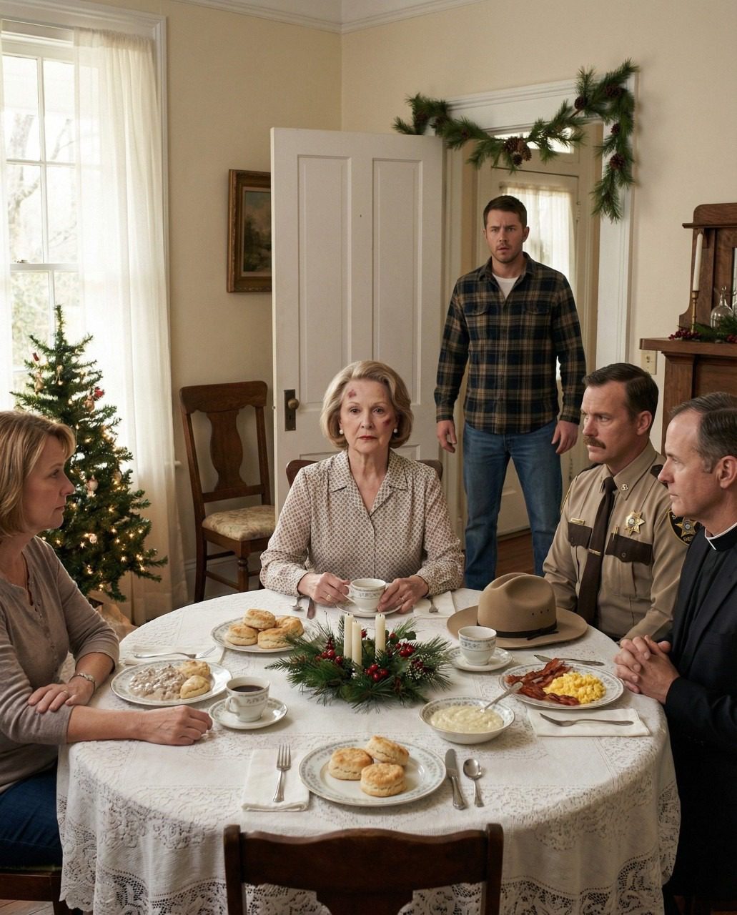 Mijn zoon sloeg me gisteravond, en ik zei niets. Vanmorgen spreidde ik mijn kanten tafelkleed uit, maakte een uitgebreid Zuidelijk ontbijt klaar en haalde het beste servies tevoorschijn alsof het een feestdag was. Toen hij beneden kwam, wierp hij een blik op de biscuits en grits, grijnsde en zei: « Het lijkt erop dat je het eindelijk geleerd hebt. » Maar de glimlach verdween zodra hij zag wie er aan tafel zat.