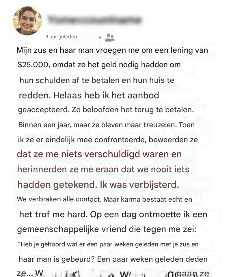 De volgende ochtend stond het geld op hun rekening. Lisa belde me op, huilend van opluchting, en bedankte me keer op keer. Een tijdje hield ik mezelf voor dat ik het juiste had gedaan. Dat dit was wat familie deed.