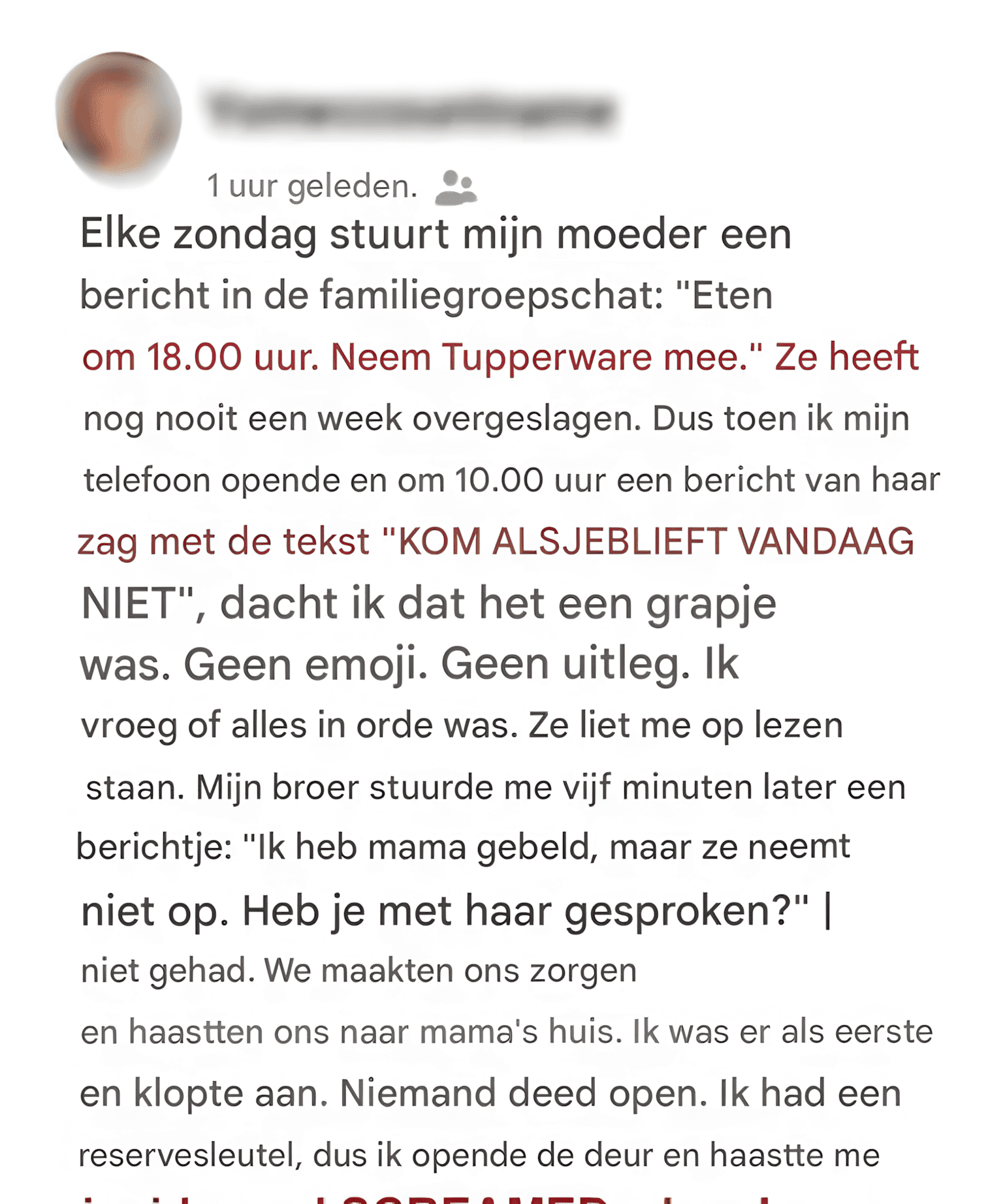 Moeder nodigde ons elke week uit voor het zondagse etentje, maar op een dag stuurde ze een sms’je: ‘Kom vandaag niet langs’ — ik ging toch en was doodsbang toen ik zag wat erin zat