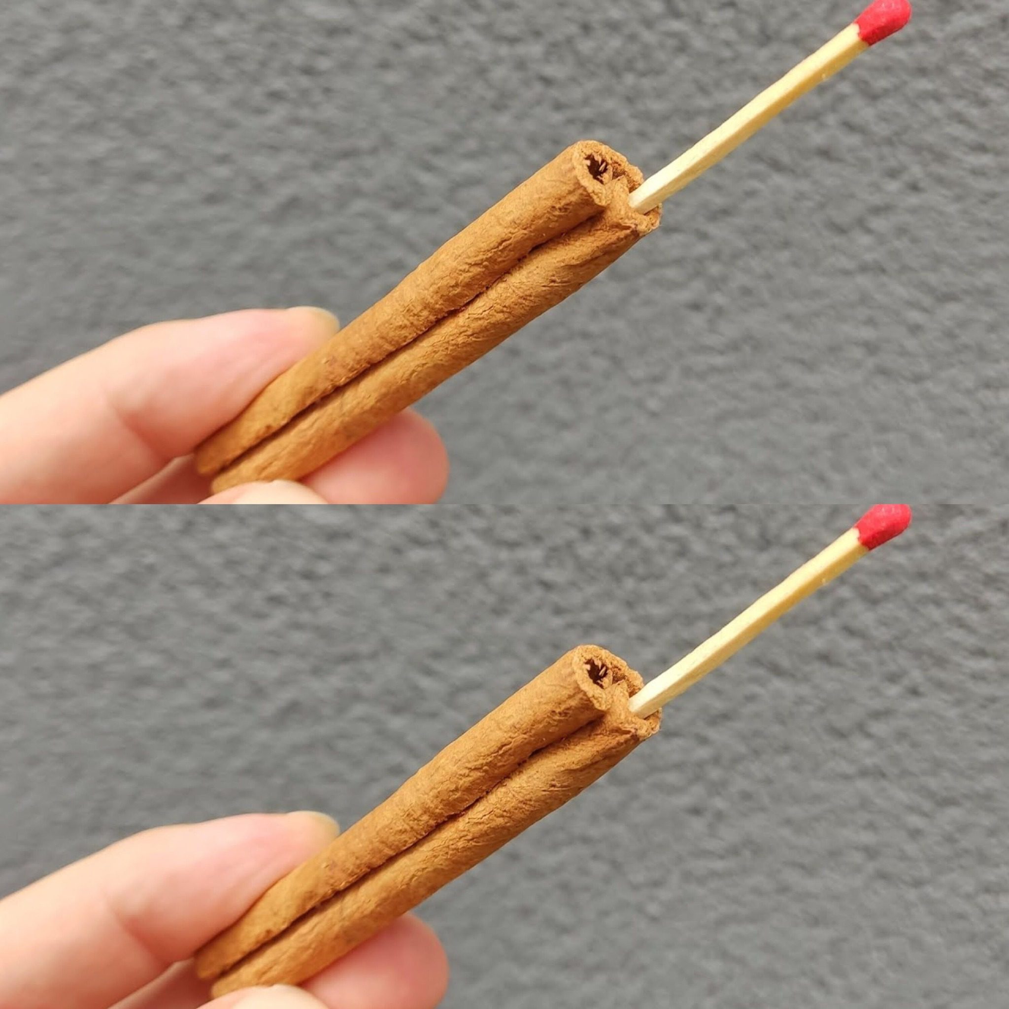 Steek een lucifer aan en houd de vlam voorzichtig bij de kaneel (wees voorzichtig en houd een veilige afstand!).