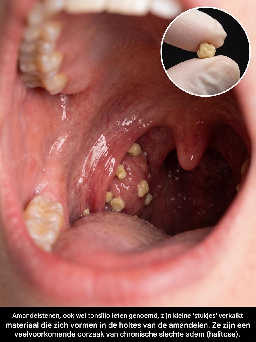 Als u ooit keelpijn heeft gehad en een klein, wit of geelachtig slijm met een onaangename geur heeft opgehoest, kan dit een amandelsteen zijn. Deze afzettingen, ook wel amandelcalculi genoemd, kunnen hinderlijk zijn, hoewel ze in de meeste gevallen geen ernstig gezondheidsrisico vormen. Zonder behandeling kunnen ze echter terugkerende klachten veroorzaken en de mondhygiëne belemmeren. Amandelstenen zijn kleine, verkalkte afzettingen die zich vormen in de amandelcrypten, natuurlijke holtes in de amandelen waar voedselresten, dode cellen en bacteriën zich ophopen. Na verloop van tijd verharden deze stoffen door contact met calciumzouten in het speeksel, waardoor deze kleine steentjes ontstaan. Hoewel veel mensen ze ophoesten zonder het te beseffen, kunnen ze in sommige gevallen hinderlijke en aanhoudende symptomen veroorzaken.