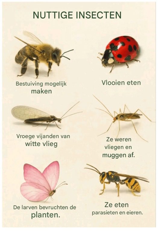 Hier volgt een gedetailleerde analyse van de afbeelding getiteld “NUTTIGE INSECTEN”, die zes groepen insecten en de diensten die ze leveren aan de tuin en gewassen laat zien. De afbeelding vereenvoudigt (en generaliseert zelfs enigszins sommige functies) opzettelijk, maar de kerngedachte klopt: veel insecten zijn waardevolle bondgenoten in de biologische regulering en vruchtbaarheid.