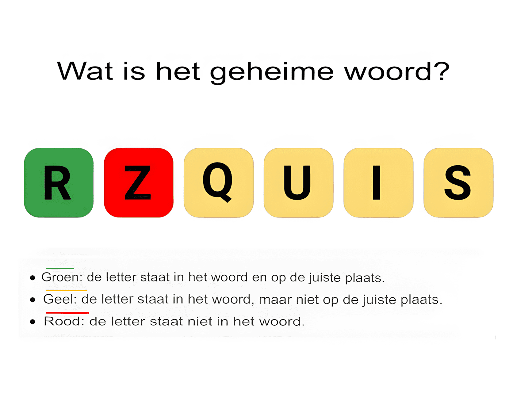 Voorbeeld: Bij 6 vakjes bevat het te vinden woord 6 letters. Als ‘R’ groen is, dan is de positie goed. De letters ‘Q, U, I, S’ in het geel zijn correct maar verkeerd geplaatst, en ‘Z’ in het rood komt niet voor in het woord.