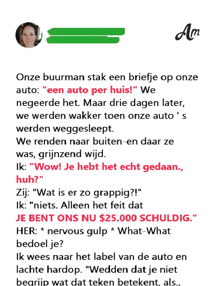 Een van de sleepwagenchauffeurs keek niet eens op. « Overtreding van de VvE-regels. Slechts één auto per woning. De bevelen zijn vanochtend binnengekomen. »