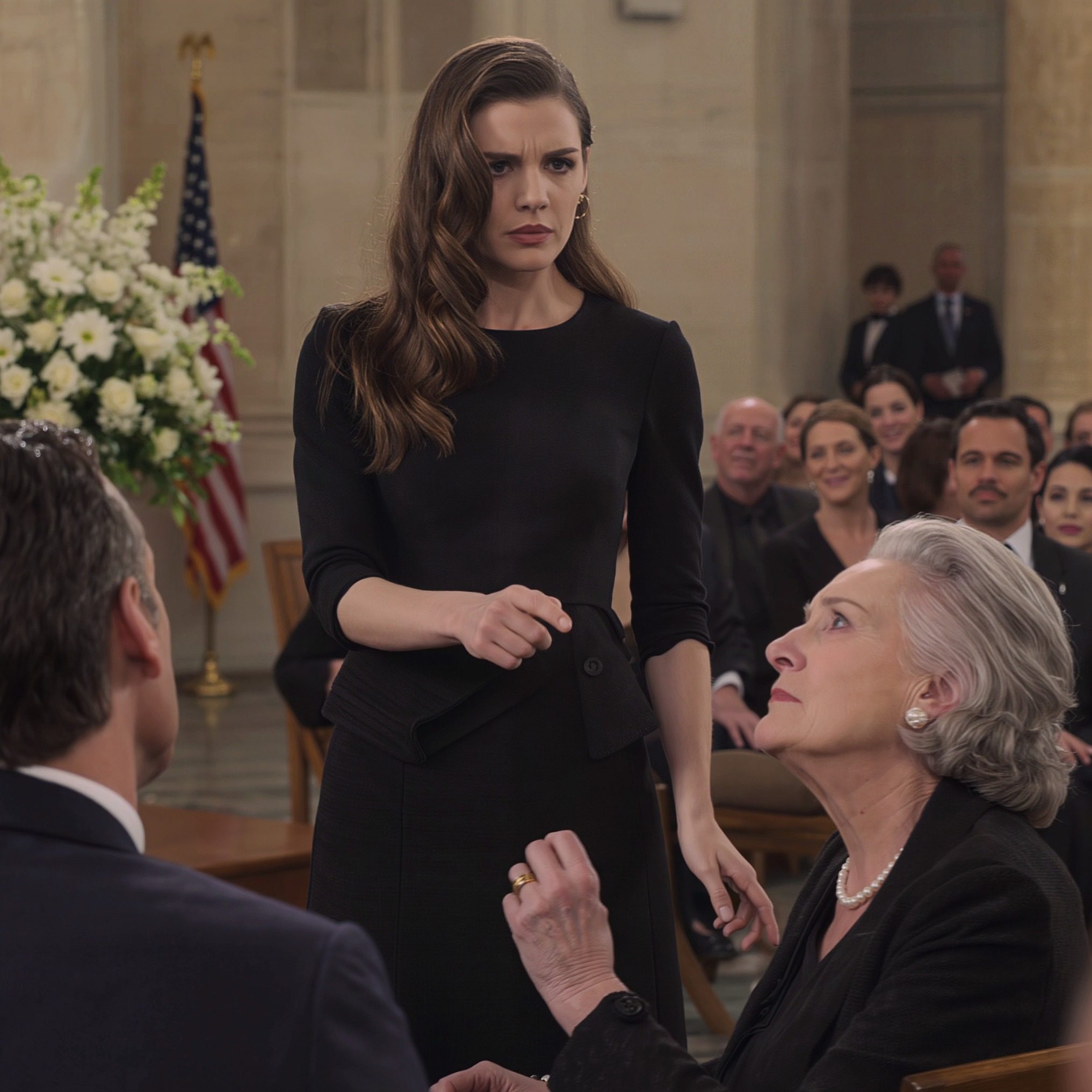 Het uitvaartcentrum zat vol met de elite van Boston: Roberts zakenpartners, onze buren uit Beacon Hill, de mensen die we al tientallen jaren vrienden noemden. Gloria, onze huishoudster al vijfentwintig jaar, zat vlak achter me, haar hand beschermend op mijn schouder. Ik voelde haar vingers zich aanspannen bij Catherines woorden.